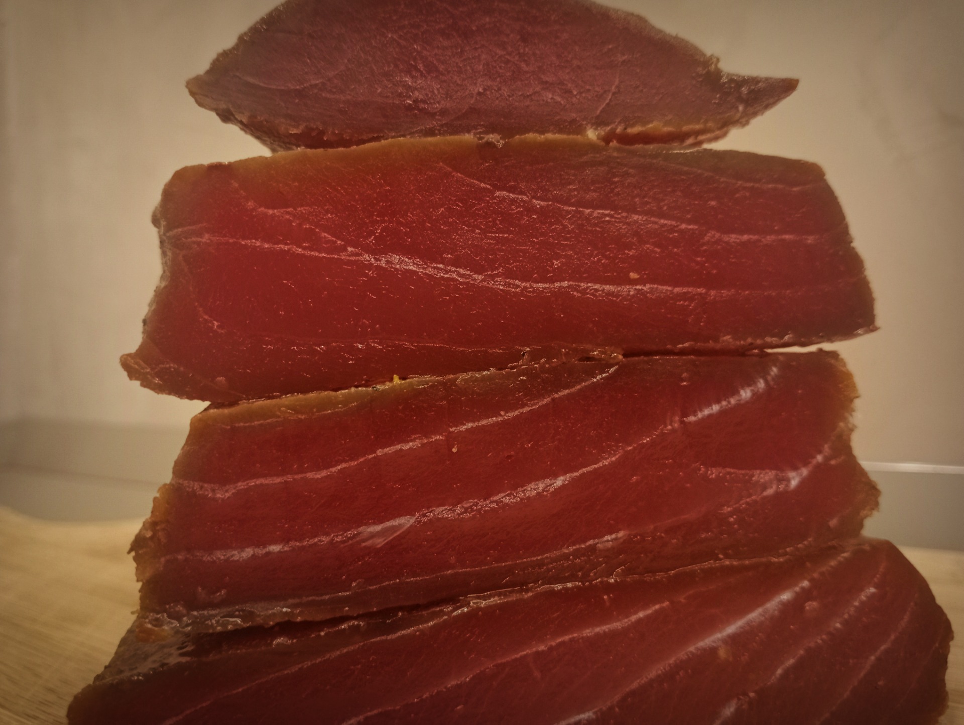 Un fantastico filetto di tonno rosso,affumicato a freddo ,speziato con un mix tra il floreale e le spezie che ricordono il natale ,per poi essere. affumicato con un blend di legni fruttati,un orgasmo per il palato,un altro prodotto al top di gamma ,da provare ....